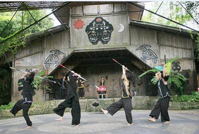 转入蚩尤山寨,仿佛置身于远古的原始部落,他们居住在依山而建的吊脚小木楼,女子身穿大襟上衣,下穿百折短裙,扎绑腿,项上戴着粗大的银环。
