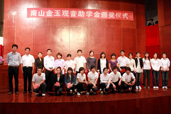 2009年12月16日晚20:00,由海南大学三亚学院艺术分院主办的南山金玉观音助学金颁奖仪式在书德楼一楼报告厅隆重举行。三亚香山金玉观音文化艺术有限公司总经理助理吴承军、主任叶慧、艺术分院党总支副书记田金明、院长助理张鑫以及团委副书记陆体锋等出席了本次仪式。
