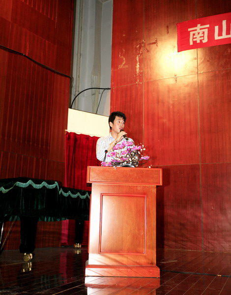 随后,三亚香山金玉观音文化艺术有限公司总经理助理吴承军先生用幻灯片向大家介绍了公司的概况以及公司总裁曾一兵先生的经典艺术作品,这让在场的每位同学深深地领略到艺术的不凡与魅力。吴承军先生代表公司希望每位获得助学金的同学们能够自强不息、学有所成,以优异的成绩回馈社会。这些真挚、生动且颇有深度的语言使现场的老师和学生深受感触。