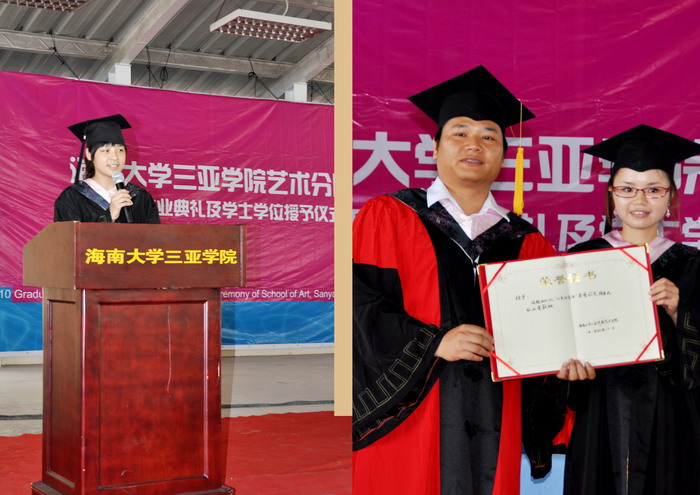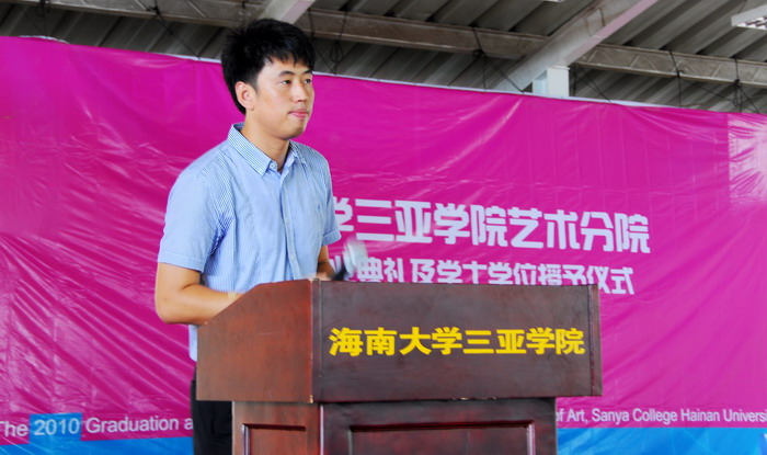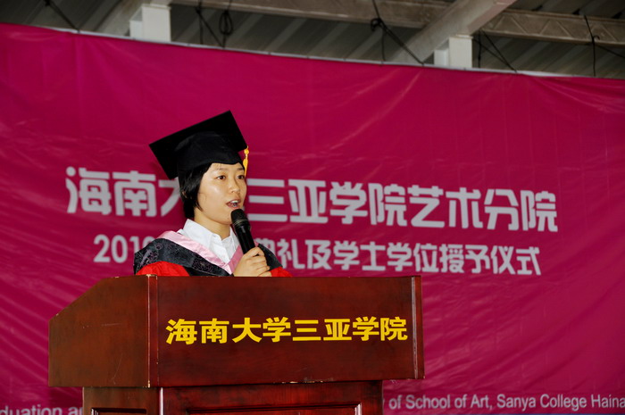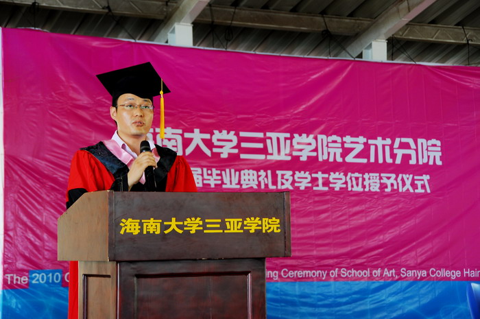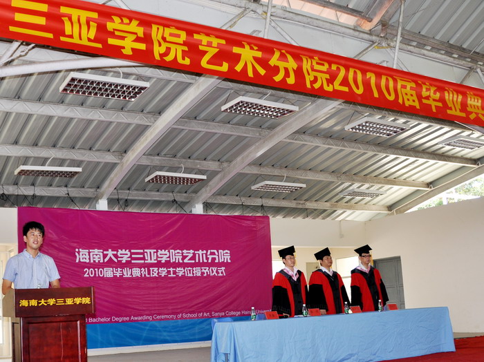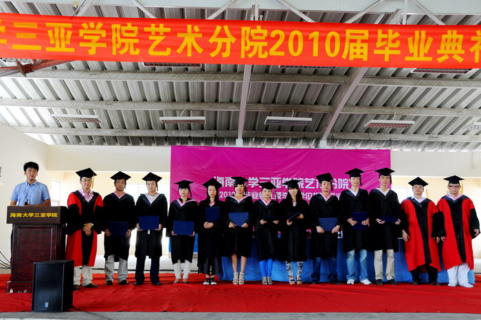 2010年6月21日上午九点半,海南大学三亚学院艺术分院2010届毕业典礼及学士学位授予仪式在风雨球场隆重开幕,本次典礼由院长助理张鑫老师主持。届时艺术分院院长陈博、院长助理张小浩博士、服装与皮具设计专业姜旺生教授以及其他各专业的专业主任、和各位辅导员老师出席了本次毕业典礼。