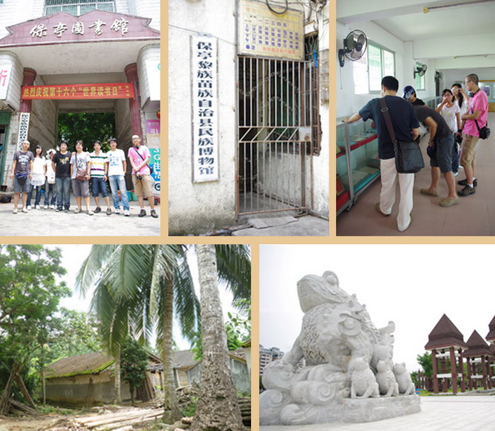 在保亭,同学们还走访了加茂镇毛林村,那里的人们仍然过着与当代都市生活竭然迥异的生活,村口的一棵老树在徐风中微微颤抖,抱守着古朴、也坚守着宁静。在离开保亭之前,同学们来到七仙广场,这是一处充满了浓郁的黎苗风情的开放式广场,采用现代造景手法表现的黎苗风格的建筑群使广场显得独特和奇异,一座座黎苗族图腾更为广场增添了几分神秘的色彩。