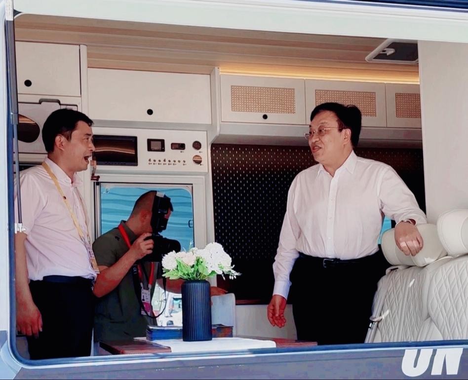 图1:海南远程新能源商用车有限公司总经理陈立忠向海南省省委书记冯飞介绍远程新能源房车
