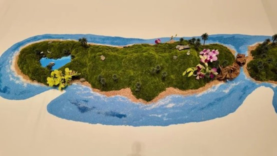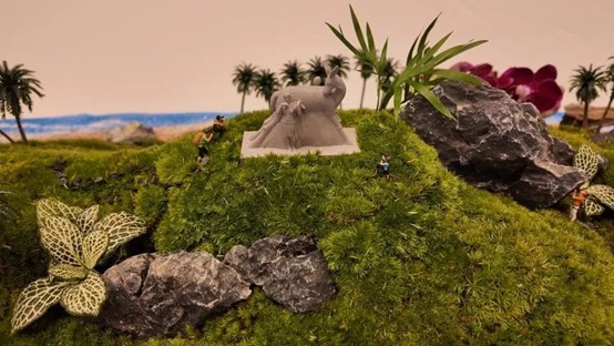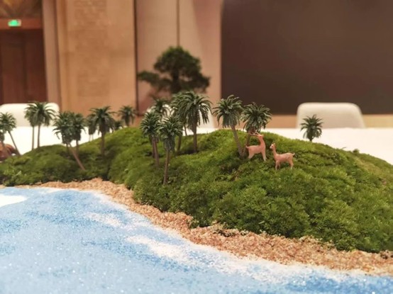 我们看到一座座由苔藓、沙石、绿植精心打造的岛屿景观蜿蜒铺展。微观的椰子树棕榈树、小巧的灯塔 ,坡鹿,还有那澄澈的“蓝色水域”,每一处细节都诉说着自然的静谧与美好,仿佛将一片世外桃源浓缩于此,让人不禁沉醉在这方寸之间的奇妙世界。