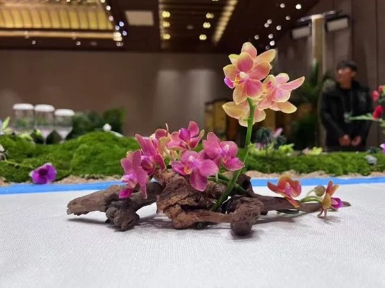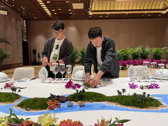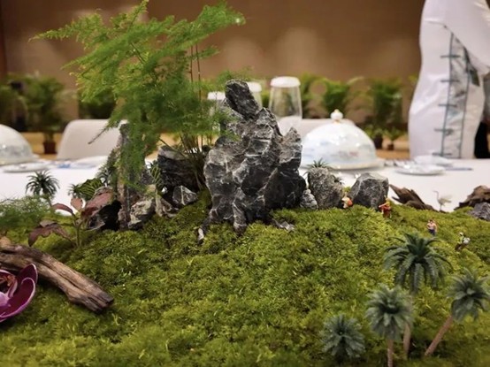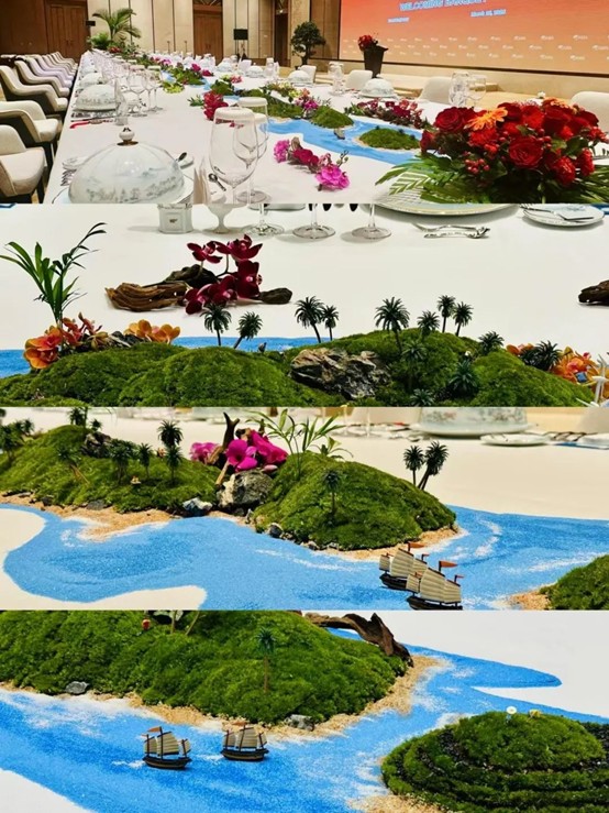 同时,考虑到国宴级欢迎晚宴对材料的严苛要求,团队在材料选择上慎之又慎。与材料供应商密切沟通,确保所选材料安全环保,无异味、无过敏原且不会产生影响食品安全的漂浮物。对苔藓、绿植等自然材料进行预处理,对人造材料的质感与色泽严格把控,力求细节尽善尽美。