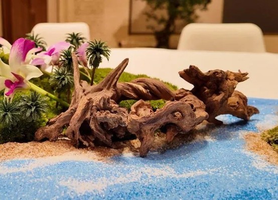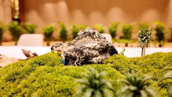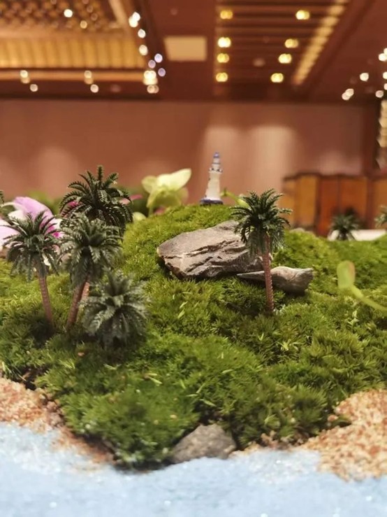 细节匠心:材料中的海南印记,为了呈现出最佳的视觉效果,团队在选材上独具匠心。白发藓在微缩景观设计中,能够很好地营造出绿意盎然的氛围;经过酸洗且带有霹雳纹的青龙石,是最能贴近海南山体的选材;沉木自身造型独特、姿态优美,在整个景观中起到了很好的调性作用,让景观更加富有设计感和层次感;石斛兰和蝴蝶兰作为热带花卉的代表,更能体现海南的地域特色。