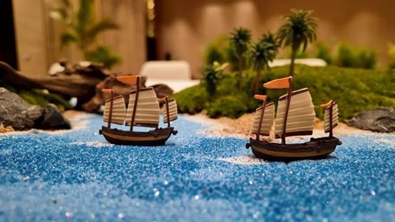 “文化之境” 如同一部徐徐展开的海南文化史书。从五指山水满乡的层层叠叠的微缩茶树,仿佛能闻到悠悠的茶香,让人感受到海南茶文化的源远流长;三亚鹿回头的传说通过生动的雕塑场景呈现,男女主人公深情凝望,背后山峦椰树环绕,再现了浪漫的爱情故事,诉说着海南的人文风情;海洋商贸景象中,商船扬帆,重现了当年海上丝绸之路的热闹繁华,彰显了海南在历史长河中的重要商贸地位。
