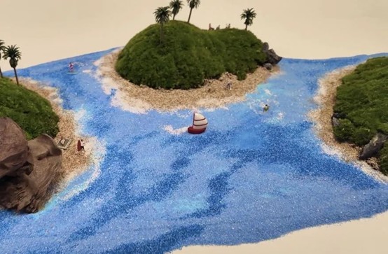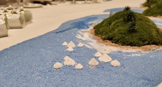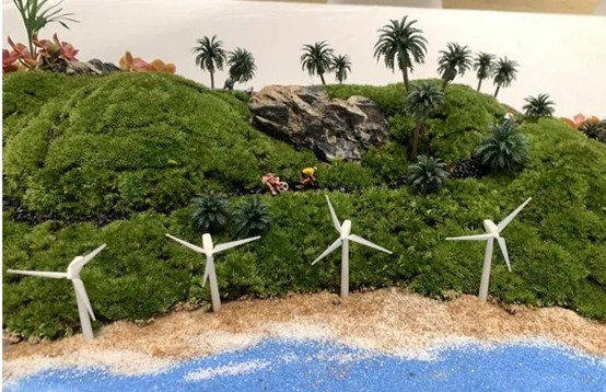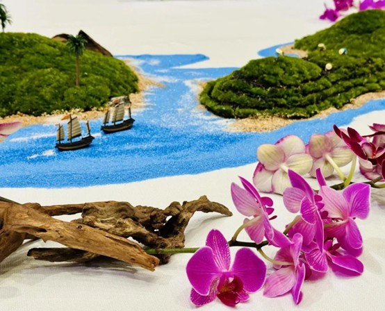 到了最后的铺沙环节,各位老师各显神通,看着蔚蓝的沙子铺满亚克力板,我仿佛听到了阵阵海浪,沉浸在那段海岛之情里。看着张颂老师的模型,点缀在“海岛”上;看着长臂猿雕塑灵动的“跳跃”姿势、白鹭雕塑优雅的“展翅”姿态。看着陈放老师奔走在“岛屿”间调节着每一束花朵、枝叶的位置。我由衷地感受到生态之美。这次经历不仅让我看到了团队协作的力量,更让我走进了海南的自然与人文。