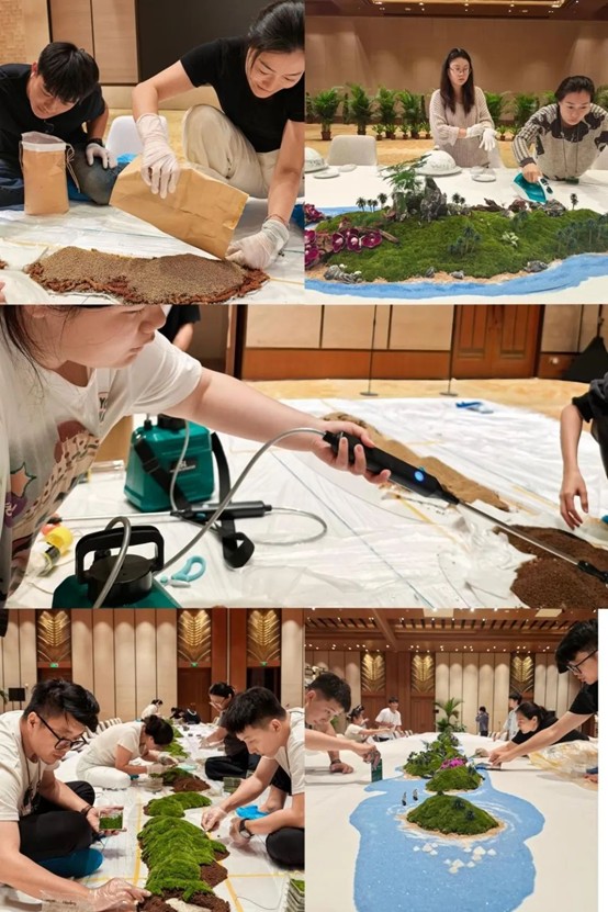 施工团队在现场搭建时,面临时间紧、任务重以及场地条件复杂等多重挑战。学院各专业成员分工明确、密切协作。陈放老师负责整体景观布局与植物种植,根据现场光线、空间条件灵活调整;于晨、林意深老师负责山脉、水体、动物雕塑等关键景观元素雕琢,以精湛雕塑技艺赋予作品生命力;张颂老师结合则关注景观整体视觉效果,对色彩搭配、标识设置等进行把控。