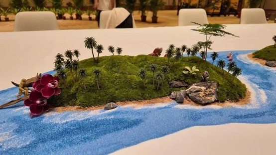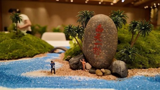 经过96小时的紧张施工,最终的微景观作品在欢迎晚宴现场完美呈现。“山海之轴”以磅礴的气势成为视觉核心,着重突出海南作为中国连接太平洋和印度洋门户的重要地位。五指山的巍峨、三江入海口的壮阔,通过精细的微缩景观生动展现;“一轴两境”的空间布局更是别具匠心,“文化之境”如同一部徐徐展开的历史书卷,从古老的文化传说到繁荣的海洋商贸,每一个场景都诉说着海南的千年故事;“生态之境”则是一片生机盎然的自然天地,珍稀动物的灵动、热带雨林的繁茂,彰显着海南独特的生态魅力。