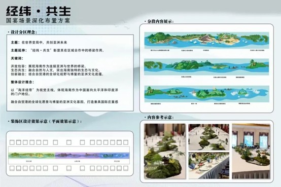 在主题构思阶段,学院团队反复研讨,紧密结合论坛主题与海南地域特色,陈琳院长凭借深厚的专业积累和对海南地域文化的深刻理解,提出 “经纬共生、一轴两境” 的创新设计概念。这一概念巧妙交织海南的自然与人文脉络,以“山海之轴”串联“文化之境”与“生态之境”,旨在通过景观叙事展现海南的多元魅力。