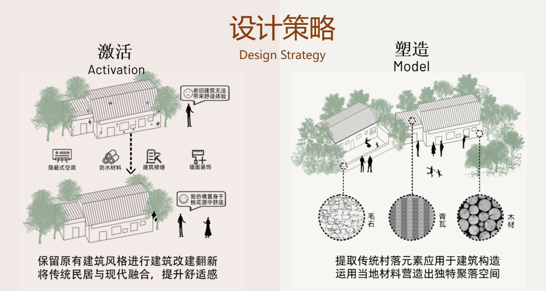 在空间规划设计上,“崖韵悠舍”充分考虑了居住与公共活动的需求。项目设置了明确的居住空间和公共空间,包括客房、庭院、餐厅和休闲区等。通过两个入口的设置,有效区分了住户与外来人员的活动空间,避免了路径的交错,提升了空间的私密性和便利性。立面展示上,设计团队补充了缺失的砖瓦,粉刷了白色墙面,重新铺装了地面,并进行了隔层封闭处理,使建筑焕然一新。