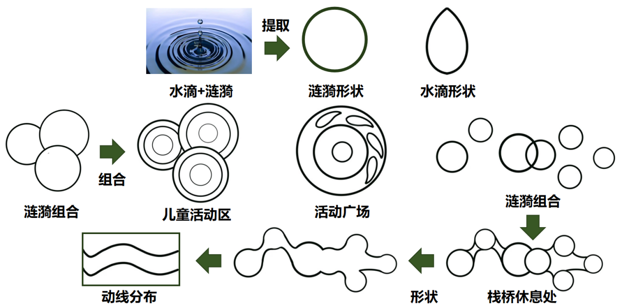 设计以“镌刻历史的桃花源--崖州古城口袋公园设计”为主题,提取“水滴+涟漪”符号贯穿空间布局,形成“一轴多核”结构——以文化体验轴串联入口展示、儿童游乐、滨水草坪等六大功能区。同时,遵循《口袋公园建设指南》生态要求,采用透水铺装、雨水花园、下沉式绿地等技术,构建年径流控制率达85%的海绵系统;植物配置以三角梅、凤凰木等20余种本土物种为主,形成“乔木-亚乔木-灌木-地被”四层垂直生态,降低30%养护成本的同时增强生物多样性。