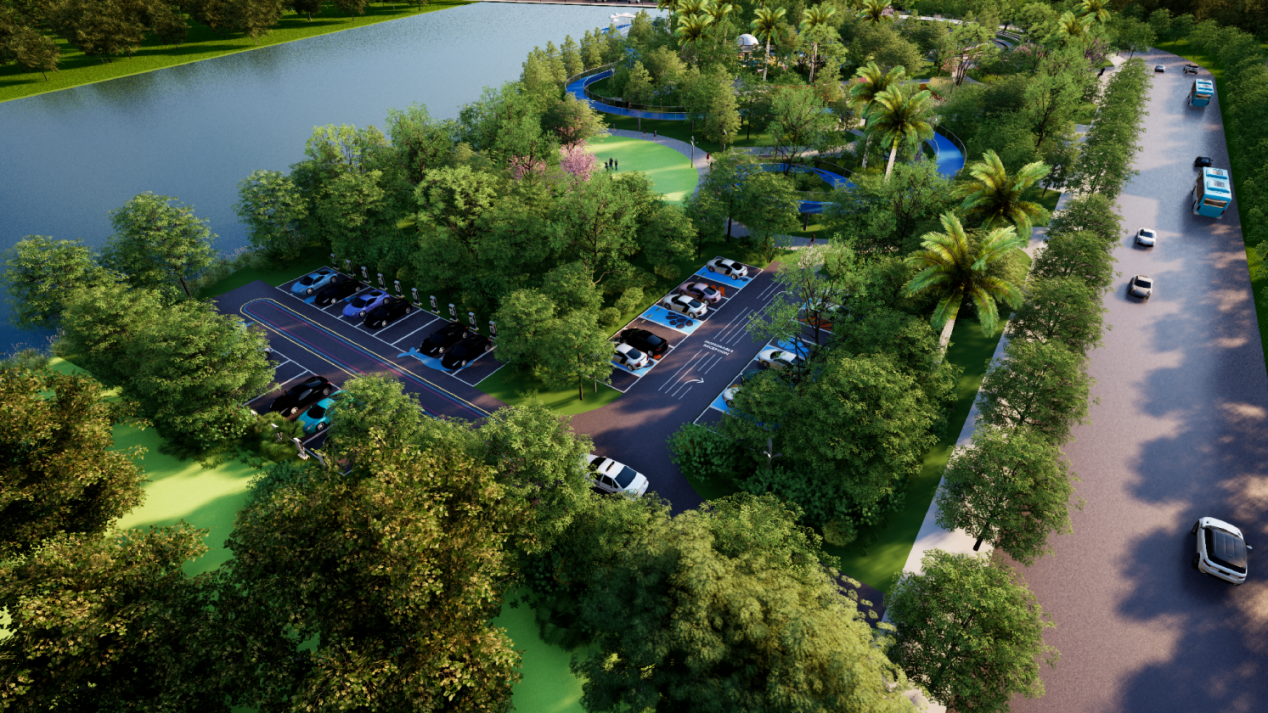 南侧停车场采用植草砖铺装,车位间以垂叶榕分隔,绿化率达25%;智能感应照明与地面涂鸦结合,融入“渔歌号子”文化符号,30个标准车位通过错峰停车设计,日均利用率提升至85%。植草砖缝隙种植狗牙根等地被植物,实现“功能化”与“景观化”的平衡。