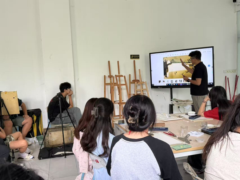 在分享教学实践环节,于晨老师结合自身丰富的教学经验,详细介绍如何将色彩规律融入基础课程教学。他指出,引导学生理解并掌握色彩规律,不仅能提升其绘画技巧,更有助于培养艺术审美与创作思维。在互动交流环节,师生们踊跃提问,就教学中遇到的色彩教学难点、学生学习痛点等问题与于晨老师进行深入探讨。于晨老师耐心解答,给出切实可行的建议,现场气氛热烈。