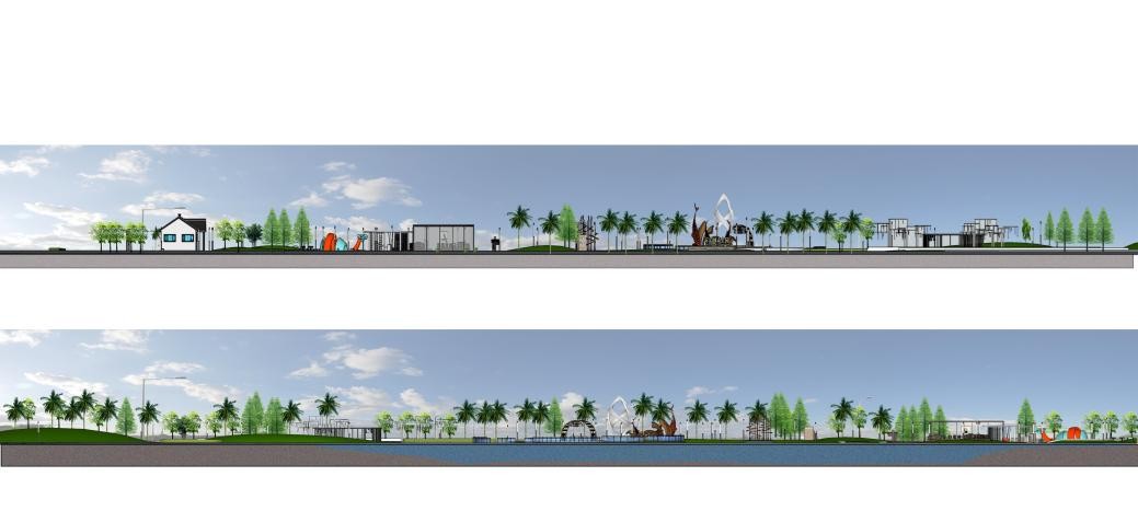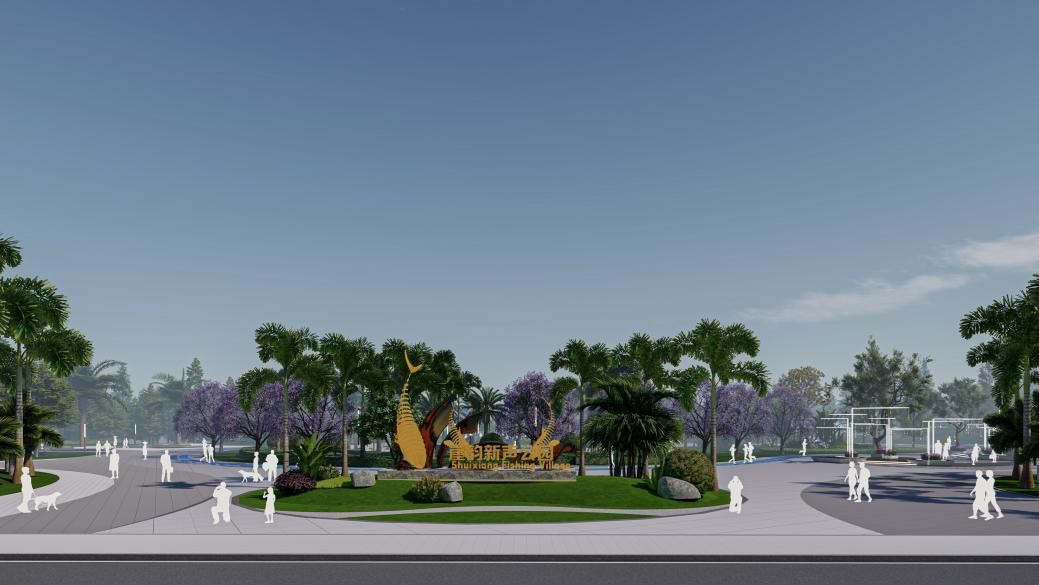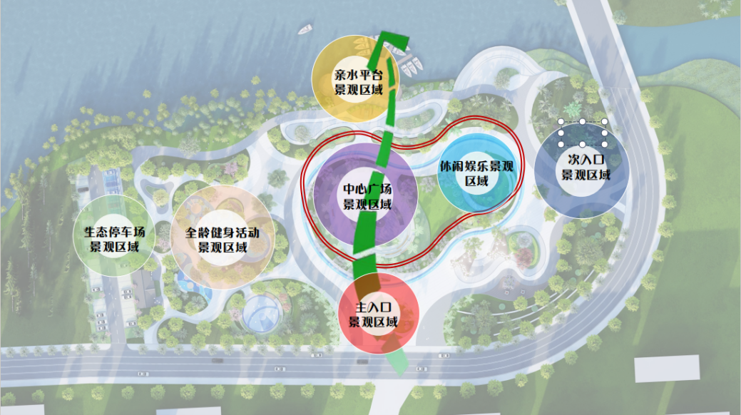 面对老城区公共空间匮乏、设施陈旧等问题,方案提出“一心一轴一环六区”的布局:“一心”即位于公园中心广场景观区域,集中展示当地文化精髓;“一轴”为东西向的文化体验轴,文化体验轴串联各个文化展示节点;“一环”为运动健身跑道环道;“六区”包括入口景观区、亲水平台景观区、休闲娱乐景观区、次入口景观区、全龄健身活动景观区和生态停车场景观区。