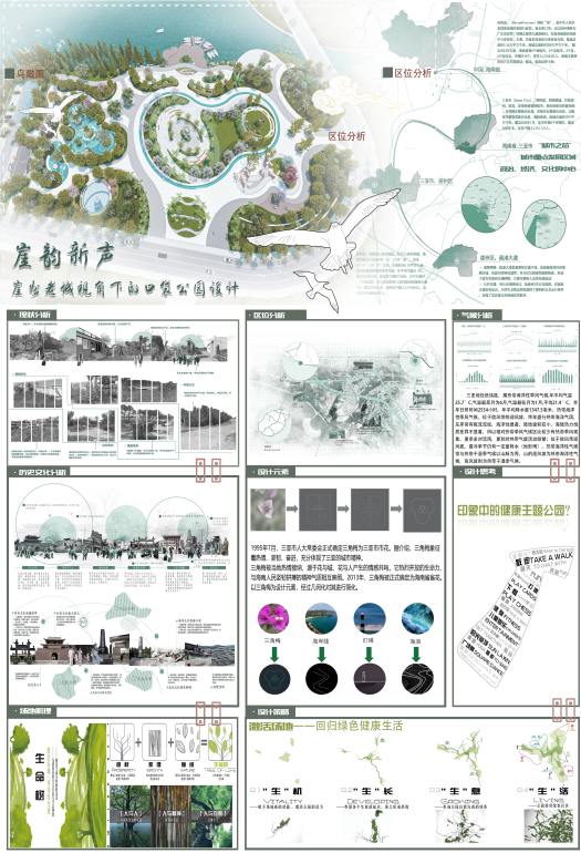 设计亮点:让文化遗产“活”起来。非遗活化:亲水平台区域设置崖州民歌互动声景装置,扫描二维码可聆听古老曲调;植物叙事:以本地椰树、槟榔为骨架,搭配三角梅、鸡蛋花等乡土植物,形成“四季有景”的生态画卷;微更新巧思:利用废弃渔船木材制作景观座椅,渔港浮球改造为灯光艺术装置,实现资源再生。