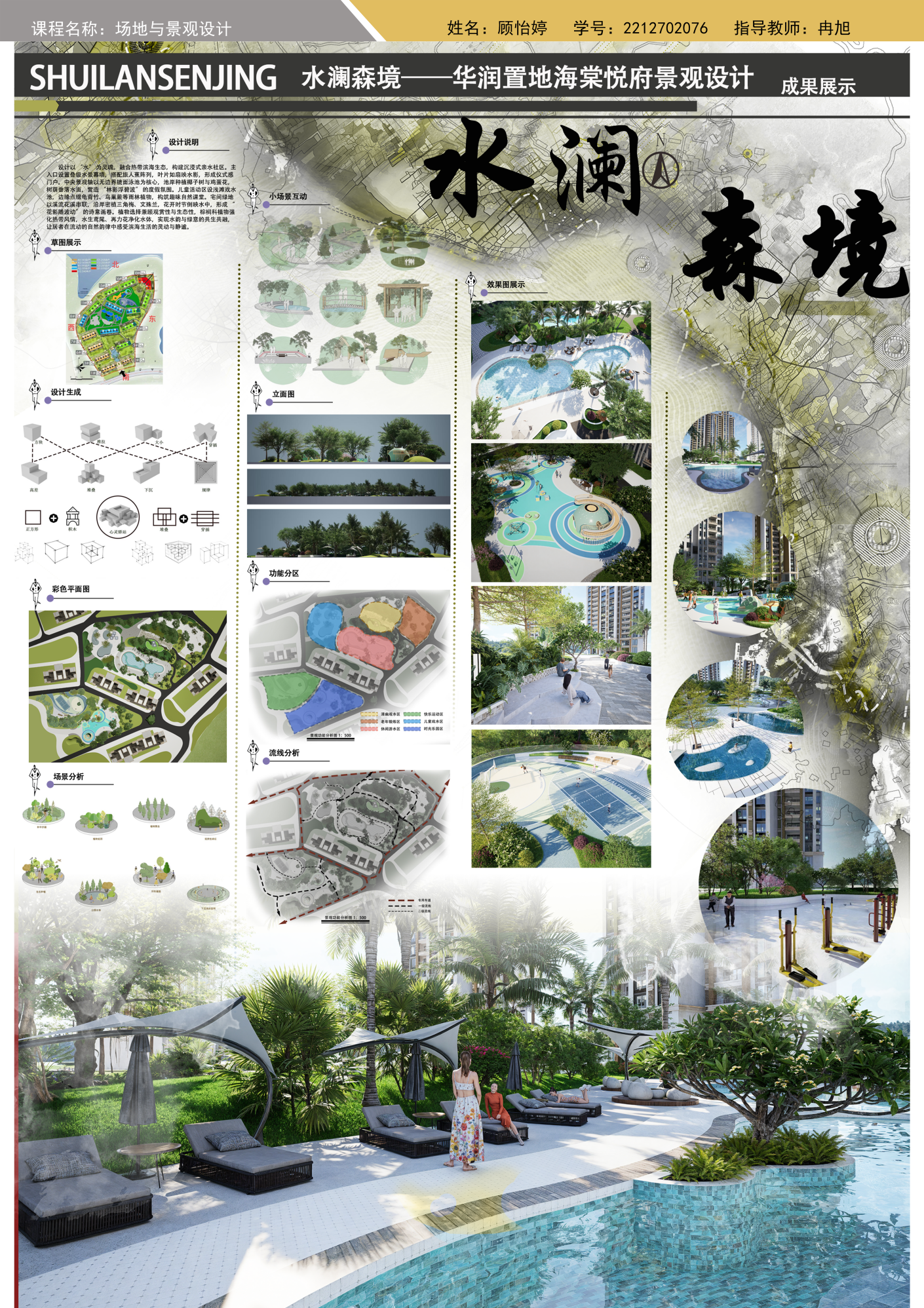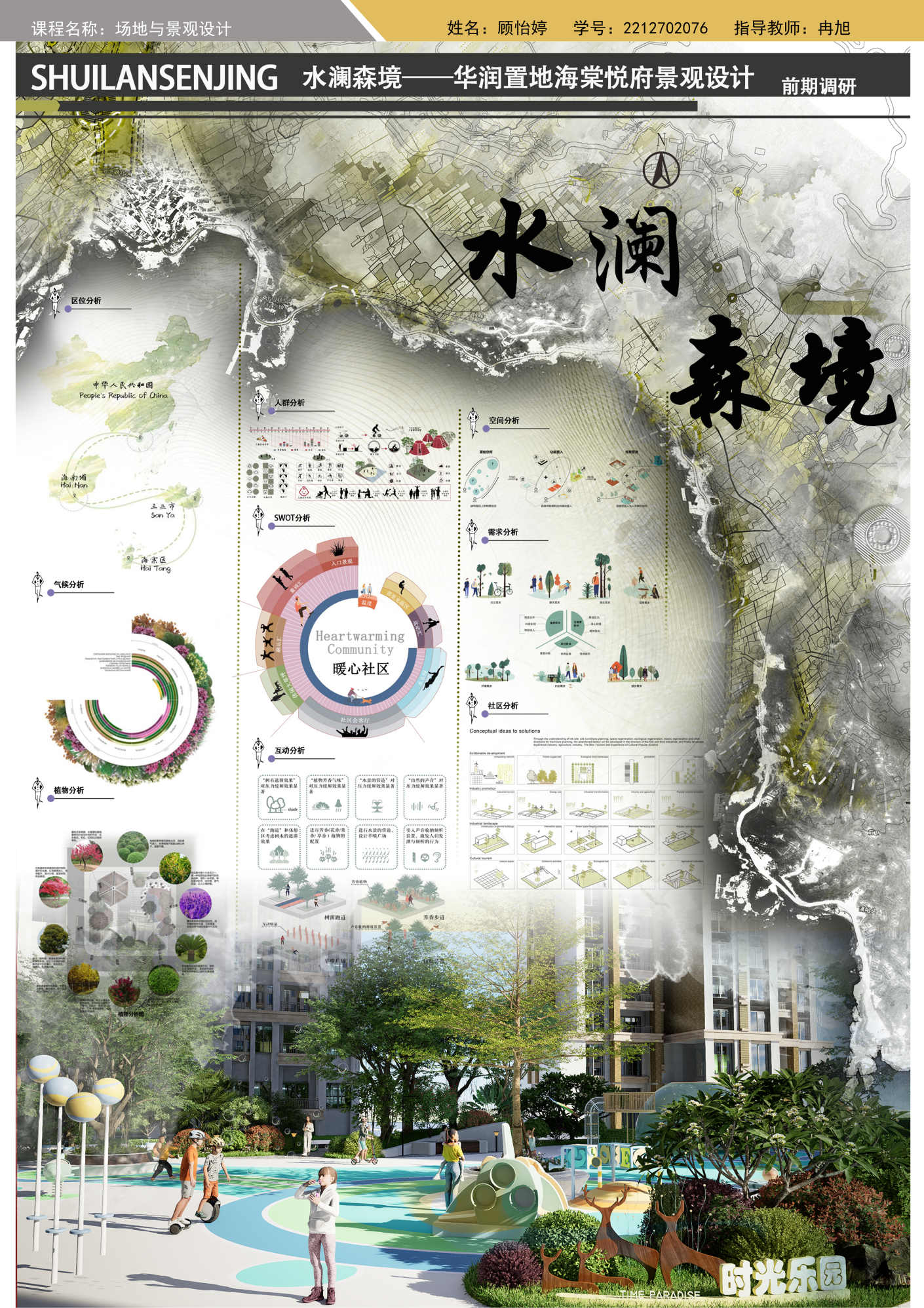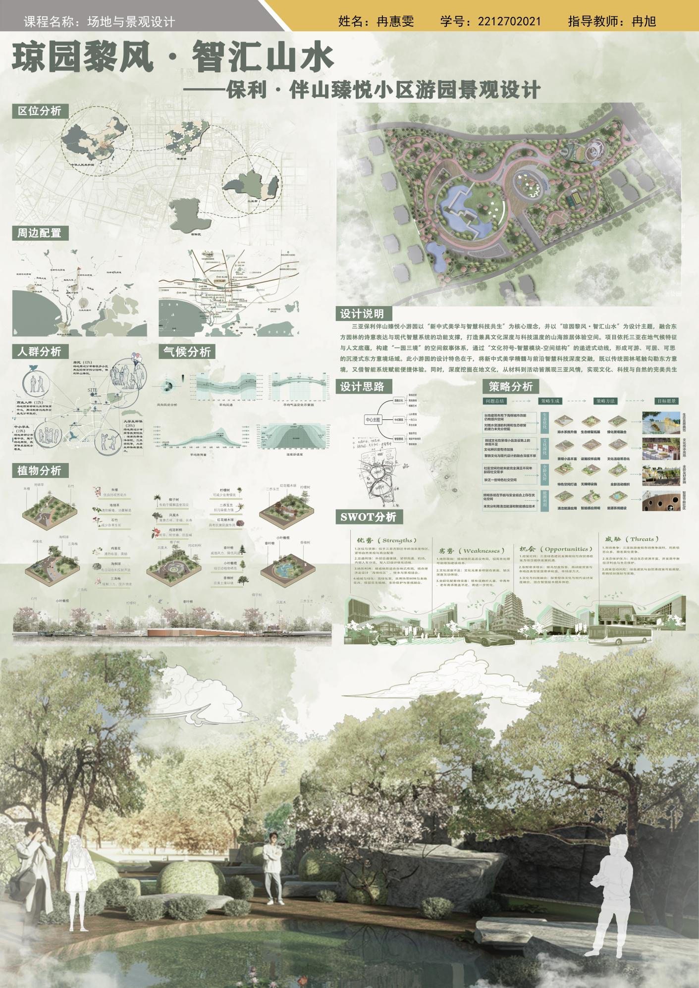 近日,三亚学院艺术暨国际设计学院环境设计专业大三学生顺利完成了为期60 课时的 “场地与景观设计” 课程学习。该课程作为专业核心课程之一,旨在培养学生对场地空间的分析、规划与设计能力,通过理论讲授、案例分析、实地调研、设计实践等多元教学方式,帮助学生深入理解景观设计理念,掌握从场地勘察到方案落地的全流程设计方法。