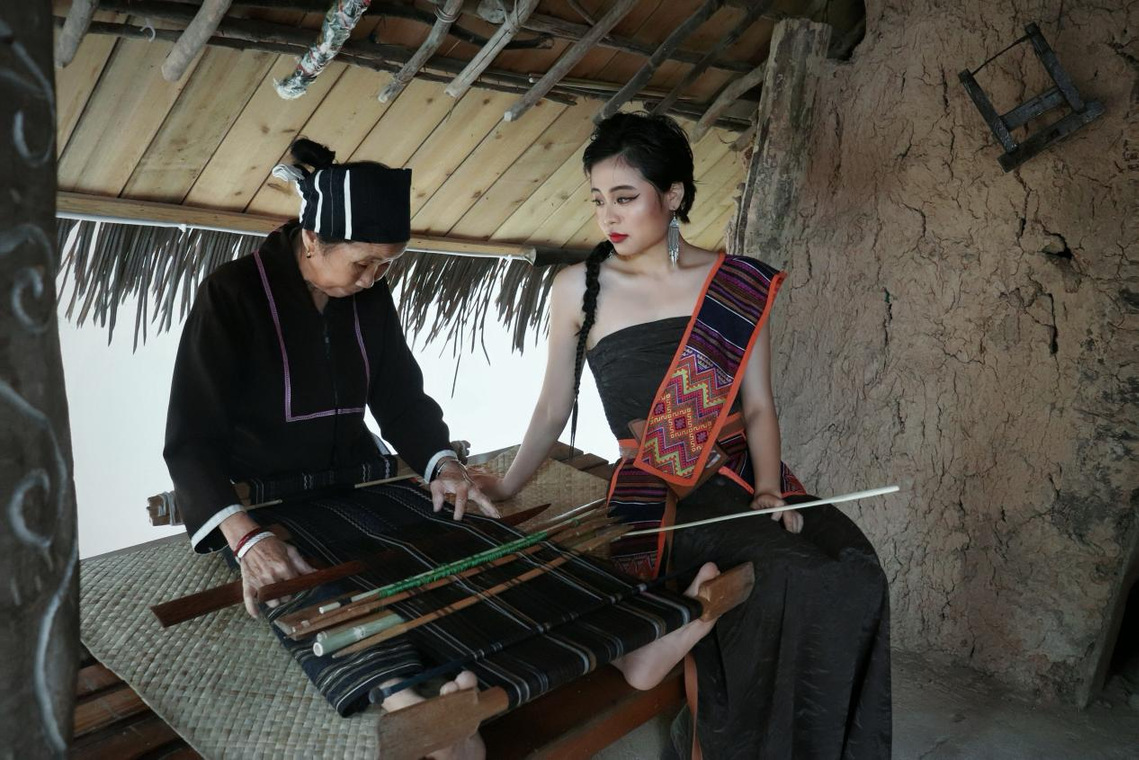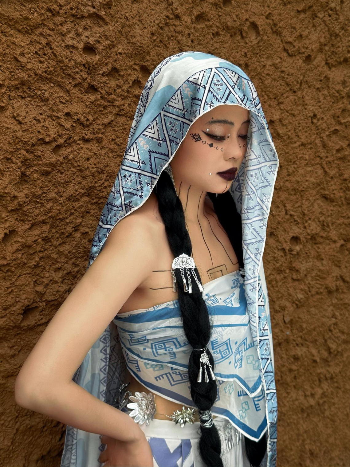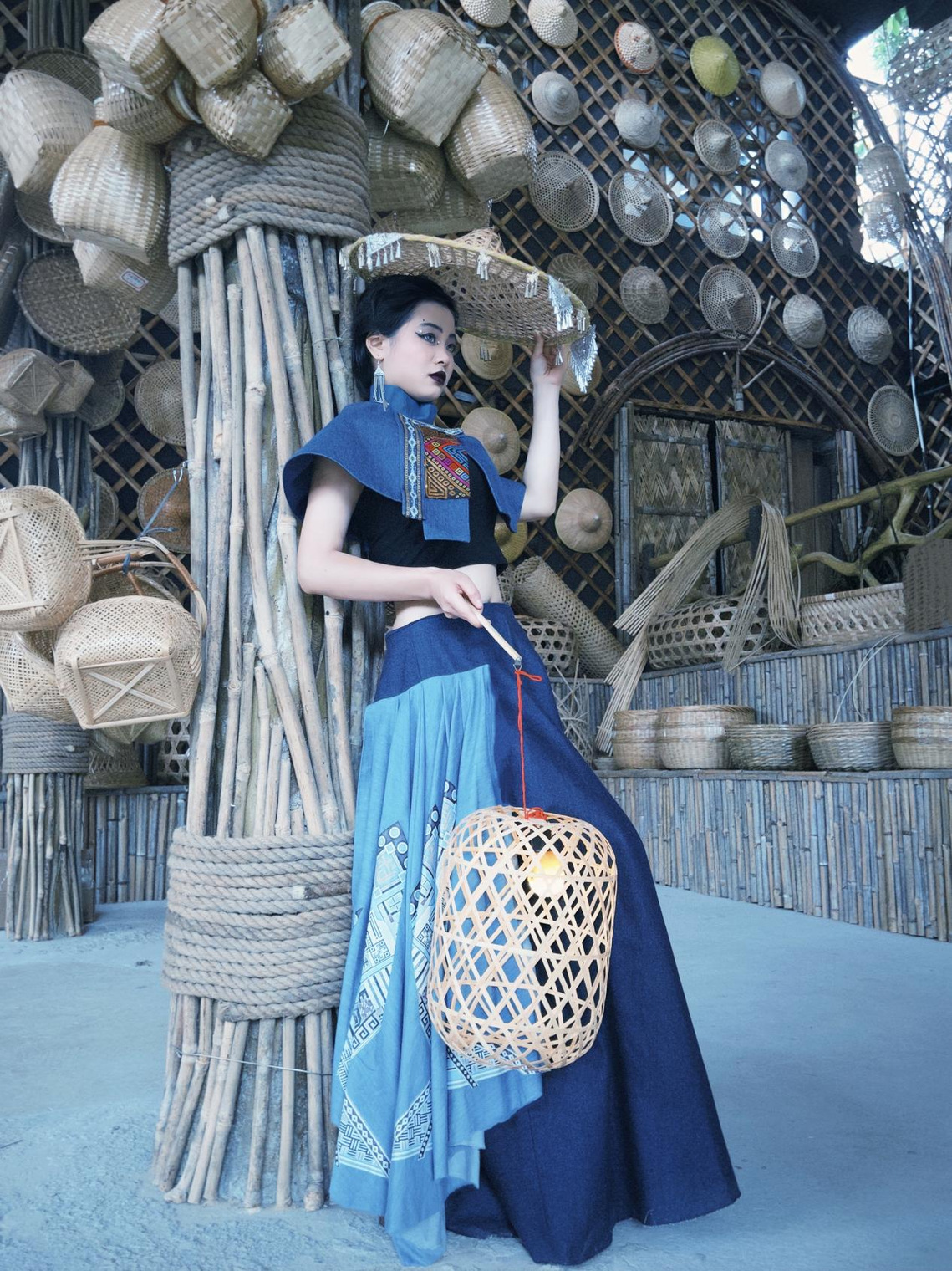 三亚槟榔谷作为国家 5A 级景区,是海南民族文化的重要展示窗口,这里完整保存和传承着黎族、苗族等少数民族的传统文化。此次选择在槟榔谷取景拍摄,不仅是因为其独特的自然风光与浓郁的民族风情相得益彰,更是希望借助景区的文化氛围,让旅拍作品更具文化深度与感染力。槟榔谷内的黎族传统村落、古老的船型屋、神秘的谷内雨林,都成为旅拍作品的天然背景,与创新设计的黎族服饰造型相互映衬,完美诠释了民族文化与自然景观的融合之美。作品由师生调研景区文化基因后创作。学生们将黎族传文身文化,传统服饰中的图腾、锦织技艺这些文化符号在设计中解构为可穿戴的时尚语言。此次创作成果可直接服务于文旅产业。