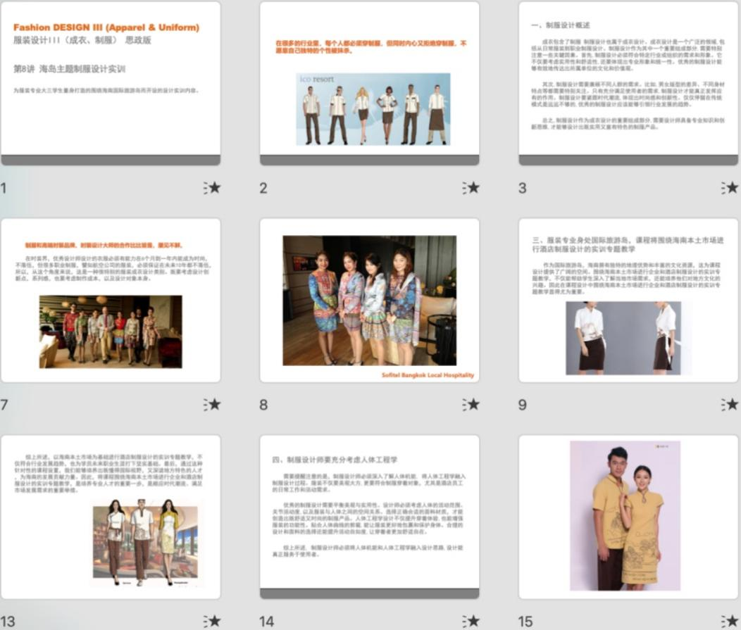《服装设计III(成衣、制服)》数字化课程项目建设,培养学生正确的的职业发展素养、价值观和商业设计思维方式。聚焦海南国际旅游岛的发展,结合本土市场的需求,聚焦于时尚品牌成衣设计、度假休闲时装、旅游亲子服饰和企业以及酒店景区制服设计等内容