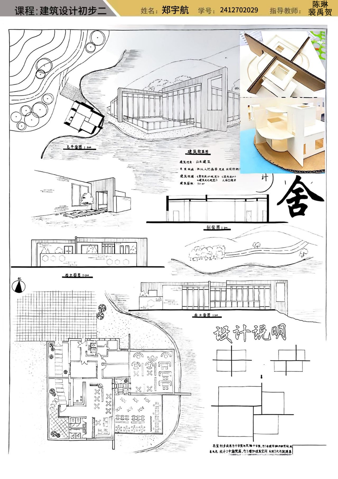 本课程的主讲教师为陈琳、吴耀华、何经、刘屹然、裴禹贺。本学期的《建筑设计初步(二)》在课程内容及授课方式上都进行了调整,课程紧密衔接制图与测绘等前序课程,结合以往分析分析大师优秀案例的训练模式,将注意力转向村民自建房调研学习,此外,本学期加强了理论课的讲解,让同学们能更好地掌握建筑设计的理论、流程,以及模型制作方法等知识。本课程组织学生进行实地考察,并进行实地测绘。同时,强调方案每个阶段中手工模型的制作,尤其强调建筑与场地的比例关系。通过模型制作与图纸比例要求,培养学生对尺度和比例的敏感性。经过一学期的学习,大部分的学生初步了解了建筑设计的方法,能独立的完成小型建筑设计方案。