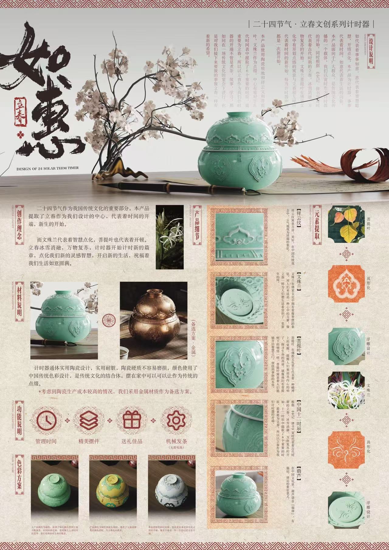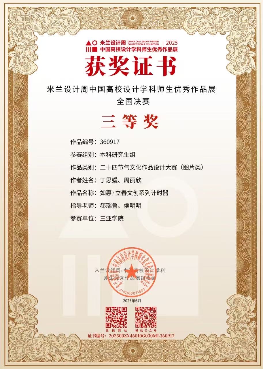 近日,从国际顶尖设计盛会米兰设计周中国高校设计学科师生优秀作品展组委会传来捷报。三亚学院产品设计专业丁思媛、周丽欣同学共同创作的《如惠·立春文创系列计时器》,在竞争激烈的全国决赛中脱颖而出,斩获“二十四节气文化作品设计大赛”本科研究生组三等奖。这不仅是中国年轻设计力量的文化自信表达,更展现了高校在传统文化创新设计领域的前沿探索。