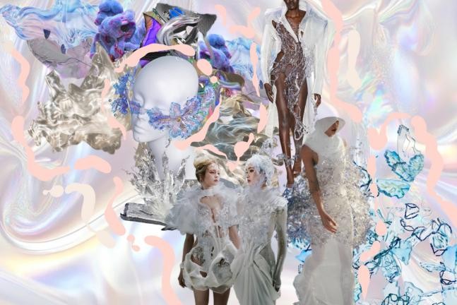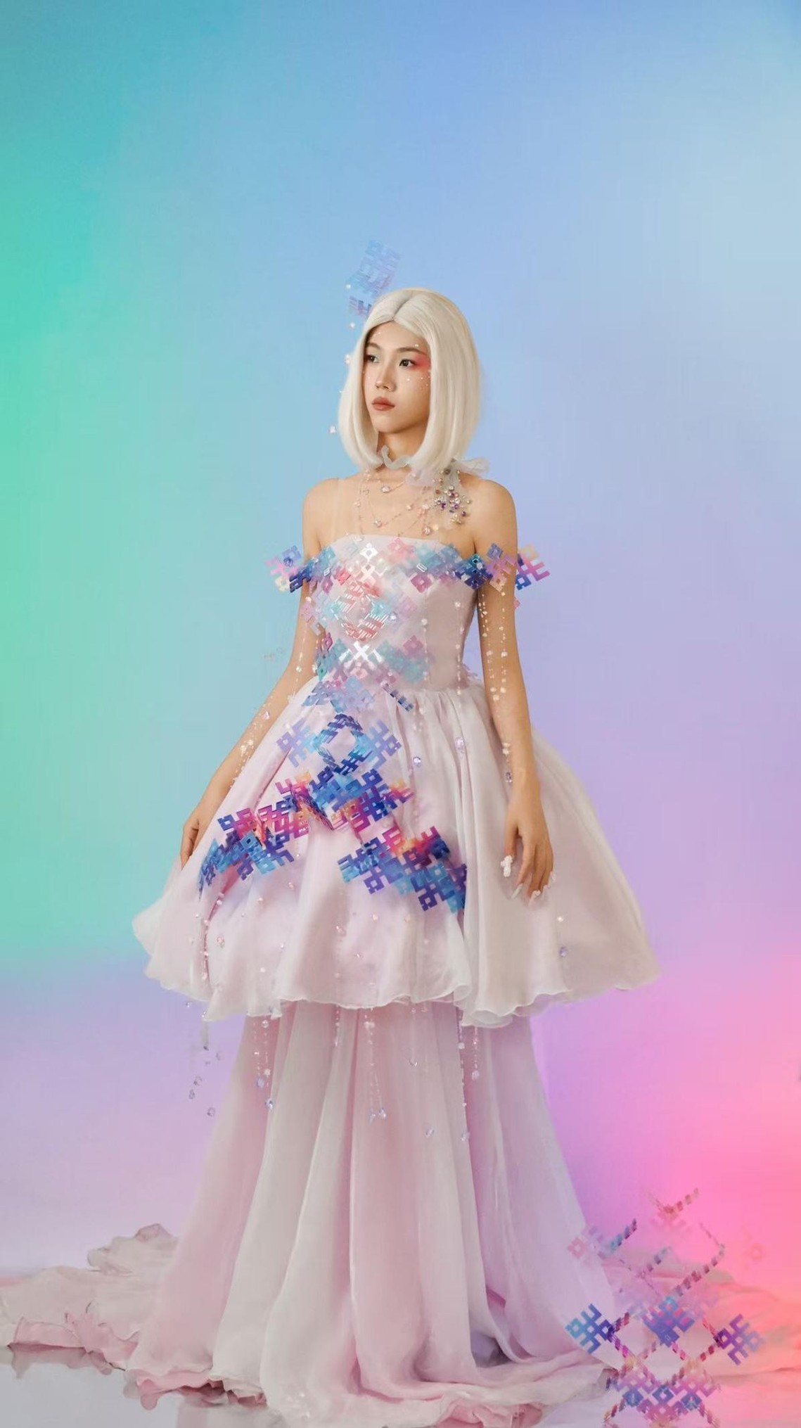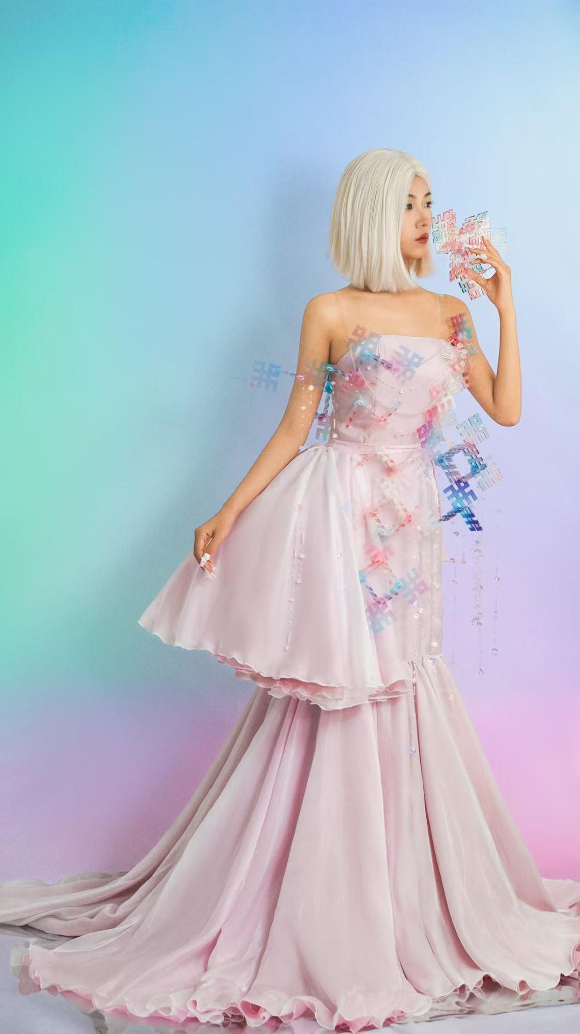 设计呈现:三套礼服展现了虚实相生的层次美学效果,内层采用轻盈垂坠的水柔纱,通过双层裙摆的层叠构造,在行走间形成如流云般的动态韵律。外层装饰突破性运用渐变幻彩的亚克力模块,以对称式设计呈现秩序之美,借均衡式布局诠释灵动之韵。这些未来感材质与几何形态的碰撞,既通过折射光线创造出霓虹流动的科技氛围,又以模块化组合解构传统礼服廓形,在璀璨华丽的视觉张力中,沉淀出大气从容的优雅格调,实现古典美学与先锋设计的精妙平衡。