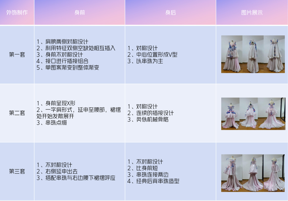 本系列设计不仅是对黎族鱼纹的充满敬意且具创意的现代表达,更致力于探索传统文化在当代语境下的活化路径。其模块化设计思路为现代礼服设计在立体造型构建(特别是外饰部分)和材料组合创新方面提供了新的实践方向。最终成果旨在以现代设计语言展现黎族文化的独特魅力,推动其在新时代的传承与发展,并为礼服设计领域注入源于民族智慧的新鲜灵感。