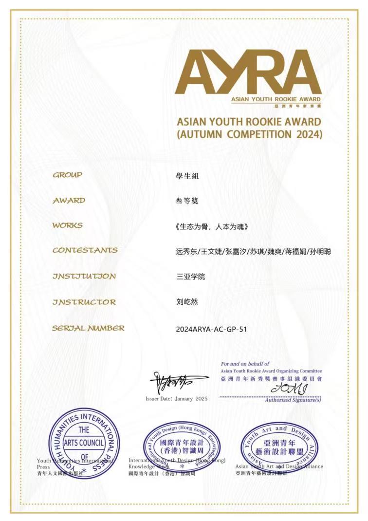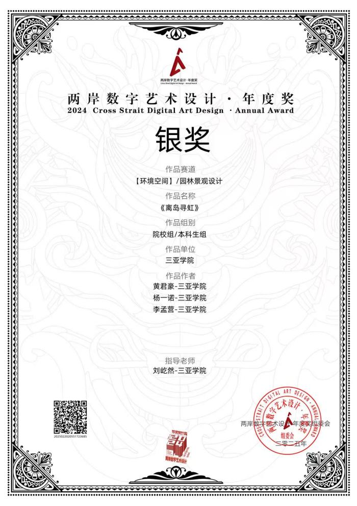 同时,专业将进一步加强与企业的合作,拓展实践教学基地,为学生提供更多的实践机会和就业渠道。鼓励学生积极参加各类学科竞赛和实践活动,培养学生的创新精神和实践能力,为社会培养更多优秀的风景园林专业人才。相信在全体师生的共同努力下,三亚学院风景园林专业必将迎来更加辉煌的明天,为我国风景园林事业的发展做出更大的贡献。以下为具体获奖的奖项证书。