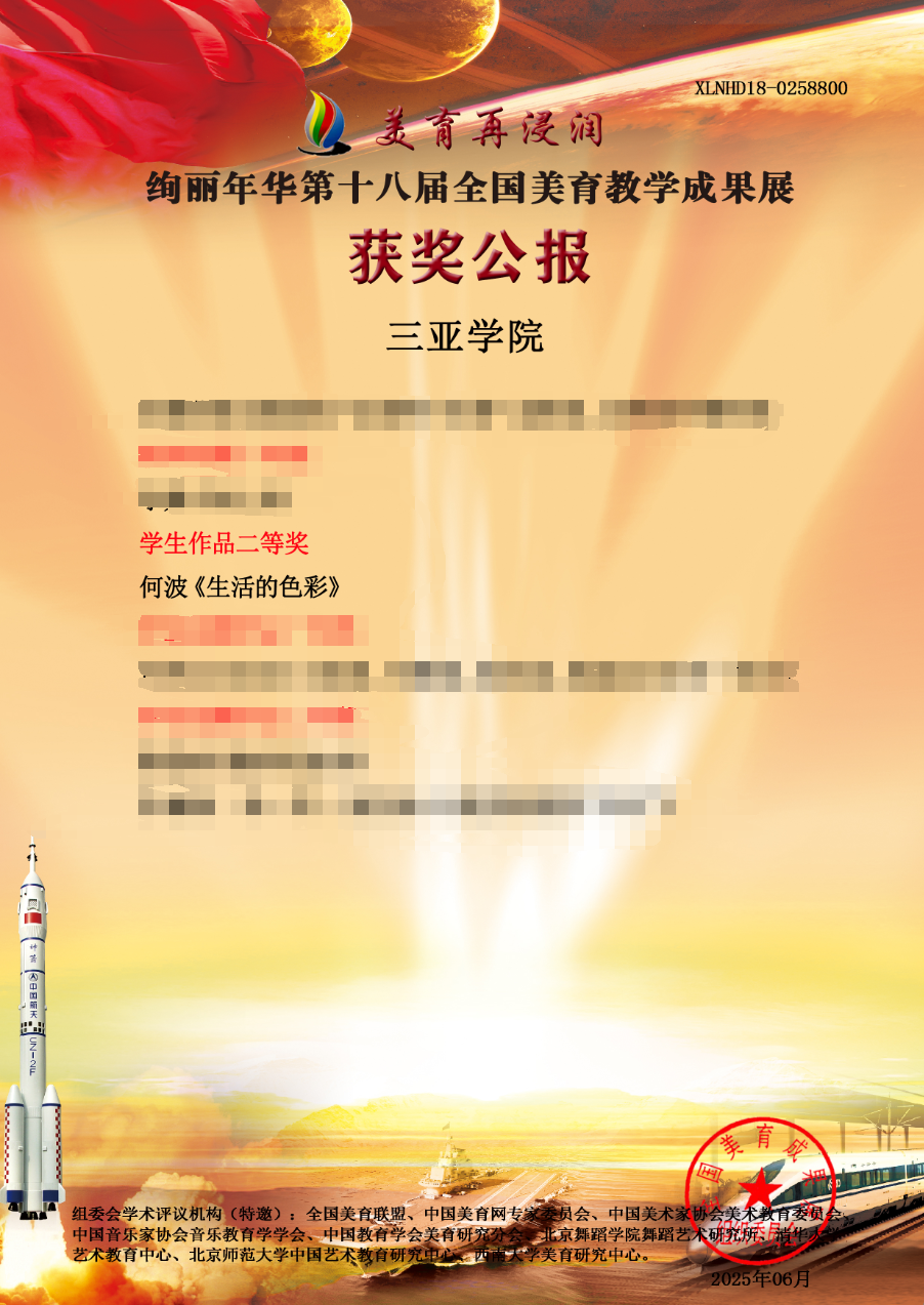 “绚丽年华”全国美育教学成果展是由教育部主管、中国老教授协会、中国教育学会等权威机构联合主办的国家级重要美育赛事。本届展览吸引了来自全国千余所院校的数万件作品参展,竞争激烈,评审严格。何波同学的作品能在如此高规格、高水准的平台上获得认可,充分展现了其扎实的专业功底、独特的艺术视角和敏锐的时代触觉。