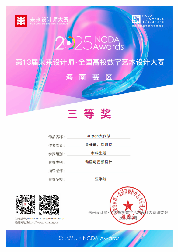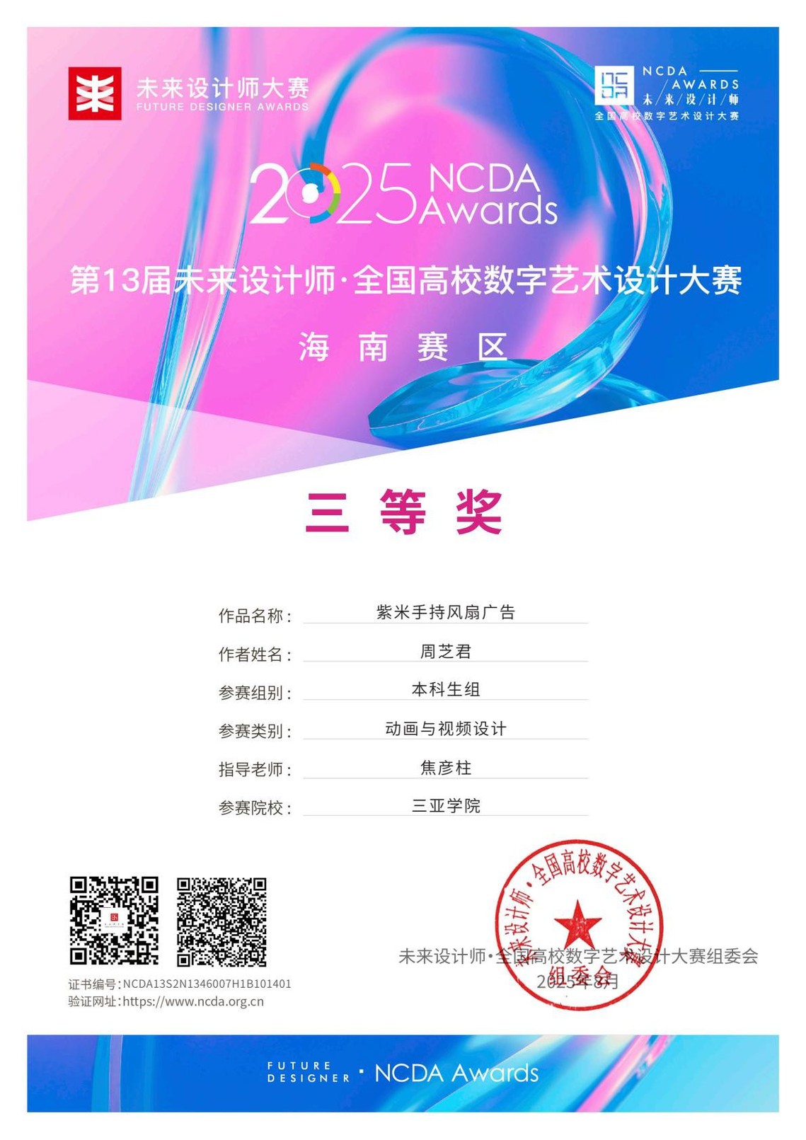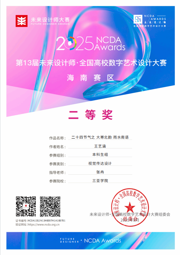 在2025年未来设计师·全国高校数字艺术设计大赛(NCDA)海南赛区评选中,三亚学院数字媒体艺术专业学子表现优异,共斩获一等奖1项、二等奖1项、三等奖3项。其中由唐煊、于卓冉、罗稀瑜团队创作的《元气森林白桃气泡水广告》以海南赛区一等奖的成绩晋级全国总决赛,王艺涵同学创作的《节气之 大寒北韵 雨水南语》 以海南赛区二等奖的成绩晋级全国总决赛,充分展现了学校产教融合的教学成果。