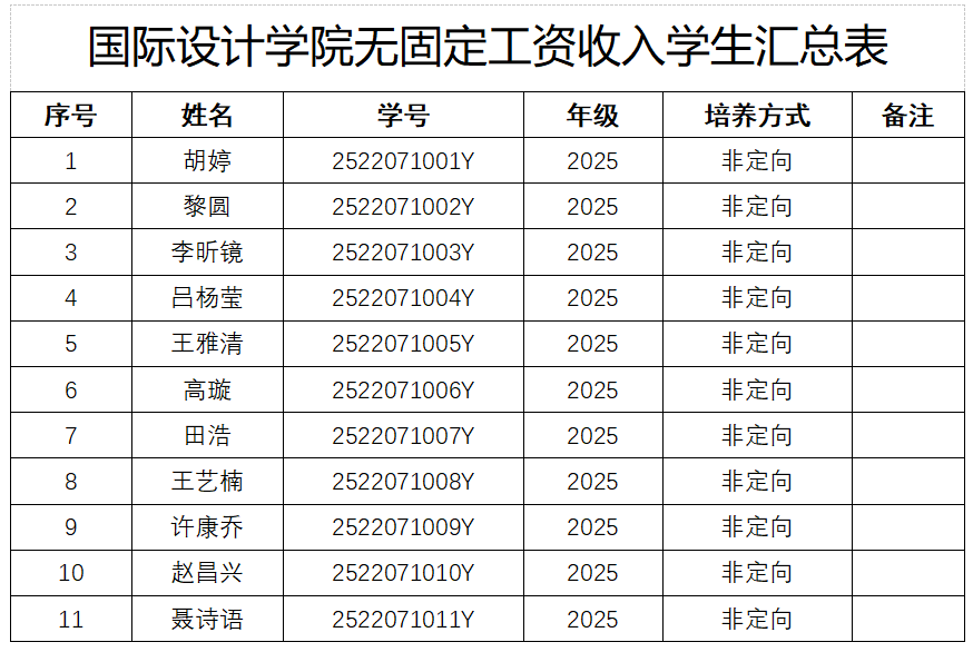 根据财政部、教育部《学生资助资金管理办法》(财教〔2021〕310号)等文件要求,本着公平、公正、公开、择优的原则,经学生个人申报,学院严格对照标准评定,艺术设计学院2025-2026学年学院奖助学金评审小组对班级评议小组提交的初步认定建议意见进行审核,确定无固定工资收入学生名单,并在学院官网公示3日,现在学院范围内予以公示。