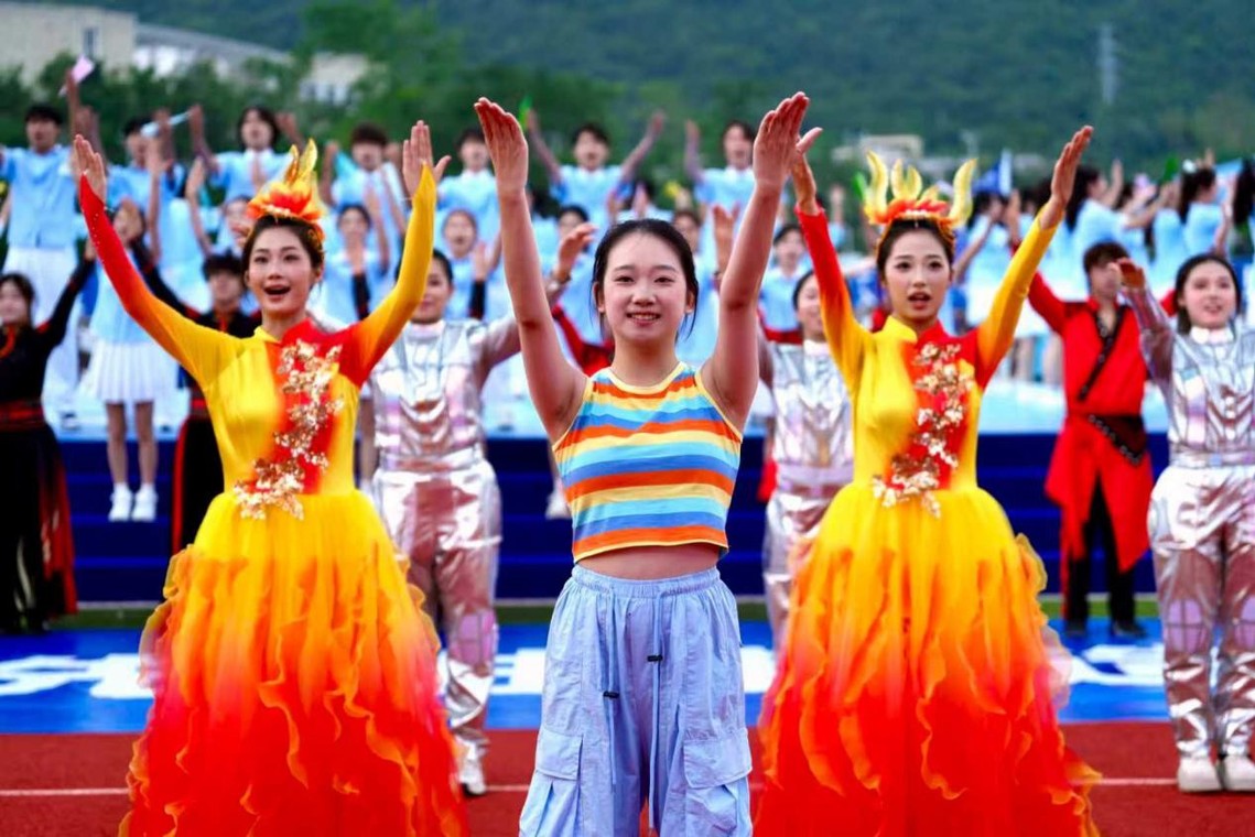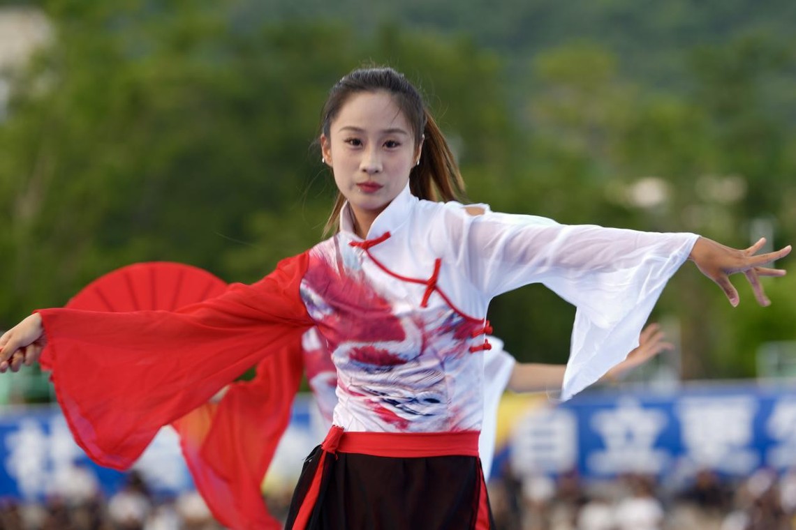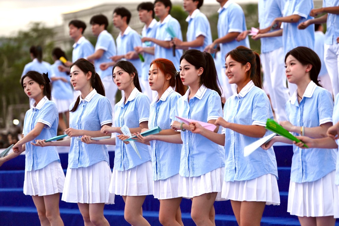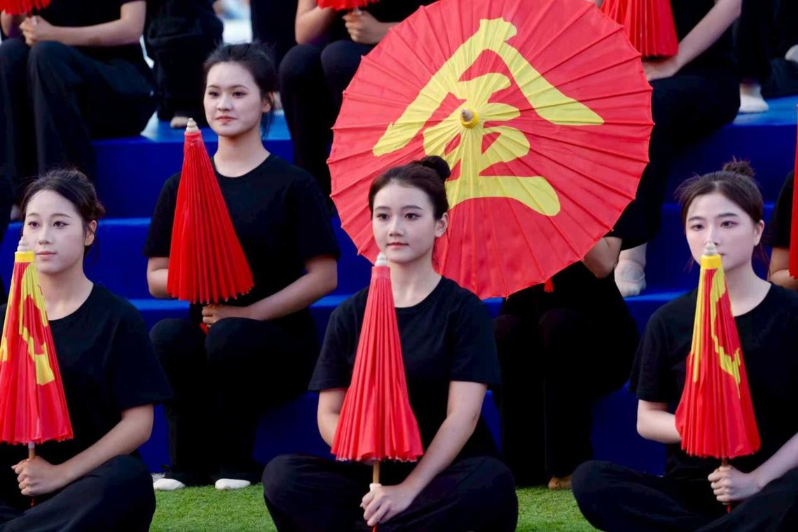 典礼中,《共生·致远》节目融合现代舞步与古典元素,舞者手持扇子,巧妙组合成具有象征意义的字形,既有传统意蕴,又具时代新意,引来阵阵掌声。