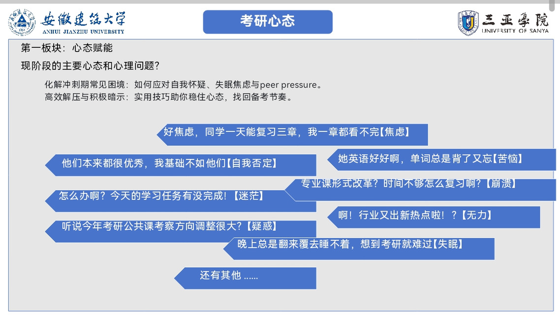分享会开篇直击备考痛点——焦虑与自责。丁浩学长指出,此类情绪多源于“过度关注他人进度”与“自我能力不自信”,并给出实操性解决方案:将精力聚焦于可控事务,通过制定“每日完成20道选择题”“背固定数量单词”等可量化目标,通过干实事打消自己对于不确定性的焦虑,还以“流水不争先,绵绵不绝”鼓励学子,强调考研成功的关键在于持续坚持,而非一时的绝对实力。
